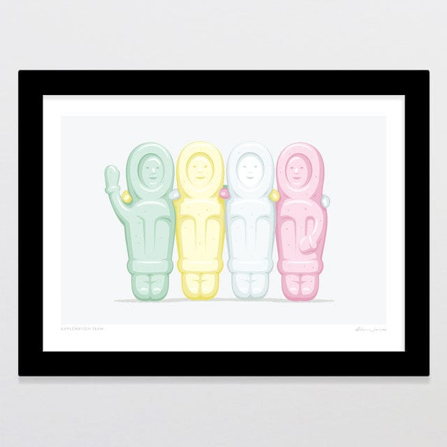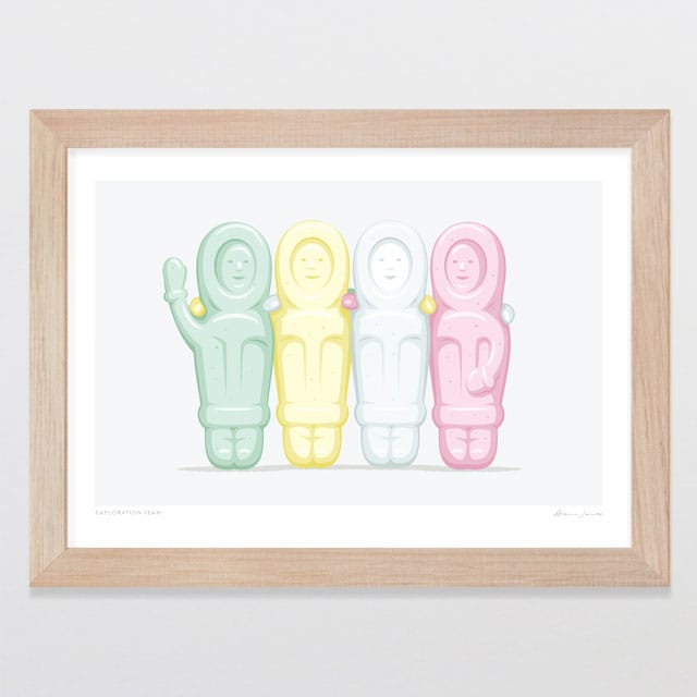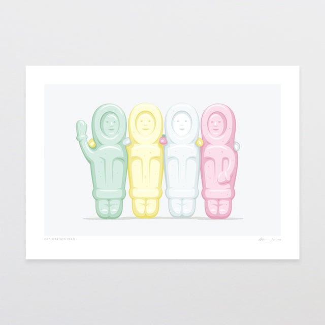 Explorers having a team photo. Three pastel green, yellow and pink people like lollies standing in formation all rugged up for a chilly team photo - this popular kiwiana print was created by NZ artist Glenn Jones. These lollies were often found in the 20c and 50c mixes, and were a chewy, marshmallowy delight.