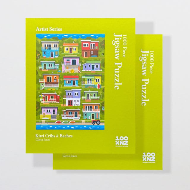 We've collaborated with 100% NZ again, creating a bespoke image combining our baches designs, lots of other kiwiana, and some kiwis for a 1000 piece jigsaw puzzle as part of their Artist Series range.